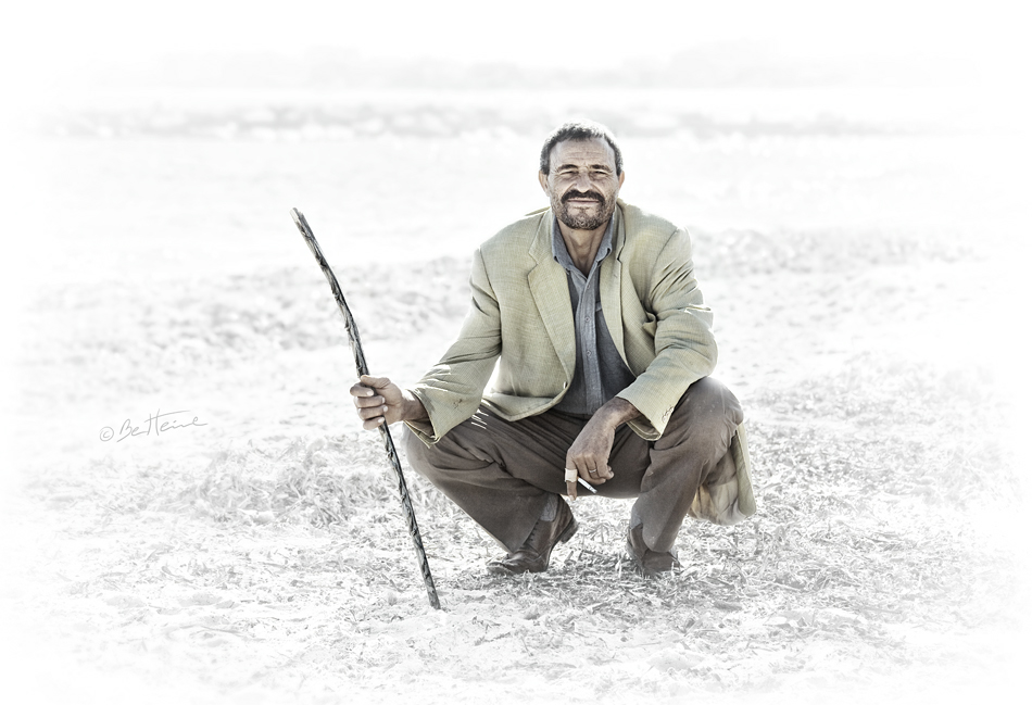 A man I met during my trip in Tunisia a few months ago. He was waiting peacefully in the sand (full of seaweed). Although I took this picture in winter, the light was really strong, the sea behind was quite and the sand very white.